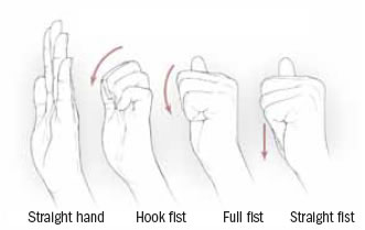 Start with the fingers extended straight out. Make a hook fist; return to a straight hand. Make a full fist; return to a straight hand. Make a straight fist; return to a straight hand. |